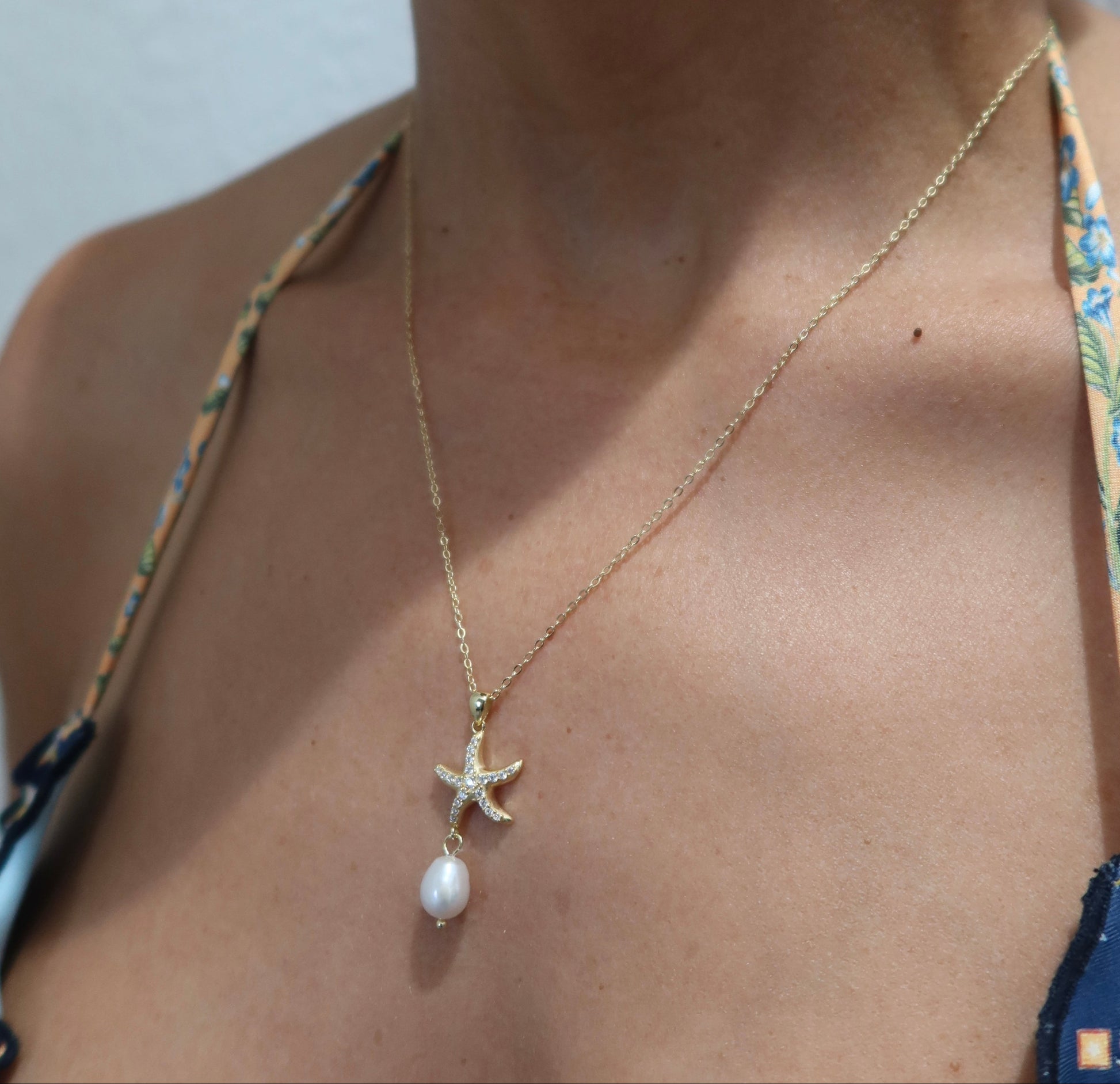 A subtle ode to the sea, the Marena Pendant features a gold-tone stainless steel chain, a pavé crystal starfish charm, and a lustrous freshwater pearl drop each element chosen to reflect effortless elegance and coastal charm.
